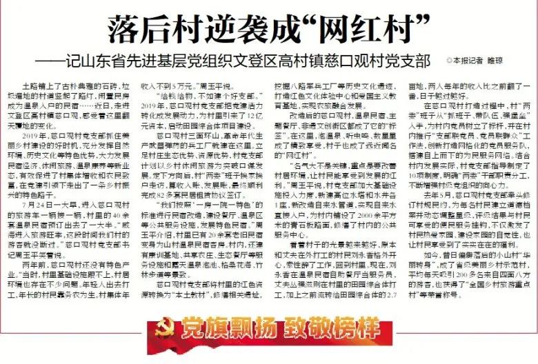 2019年,慈口观村党支部抓住美丽乡村建设的好时机,充分发挥自然环境、历史文化等特色优势,大力发展民宿经济、休闲旅游、温泉康养等新业态,有效促进了村集体增收和农民致富,在党建引领下走出了一条乡村振兴的特色路子。