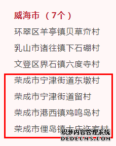 2021年底,山东省文化和旅游厅、省发展改革委联合开展了全省乡村旅游重点村培育及评审工作,共有62个村庄获评全省乡村振兴重点村(精品旅游特色村)。荣成市宁津街道东墩村、宁津街道留村、港西镇鸡鸣岛村、俚岛镇大庄许家村上榜。
