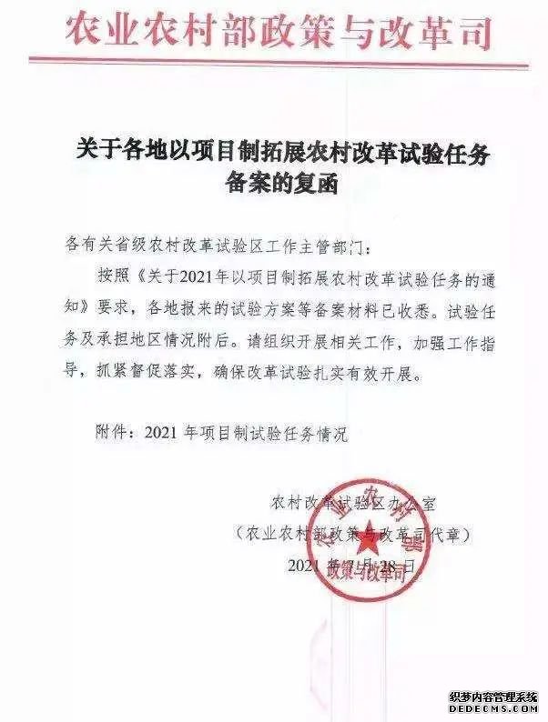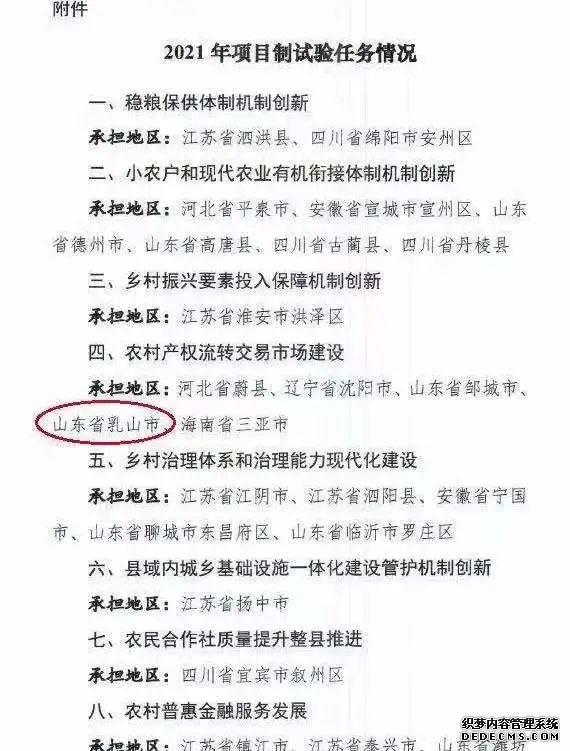 2021年7月28日,农业农村部农村改革试验区办公室下发《关于各地以项目制拓展农村改革试验任务备案的复函》,乳山市成功获批全国2021年农村产权流转交易市场建设项目制试验任务,是威海市唯一1个、全省2个、全国5个获批该项目的县(市、区)之一。