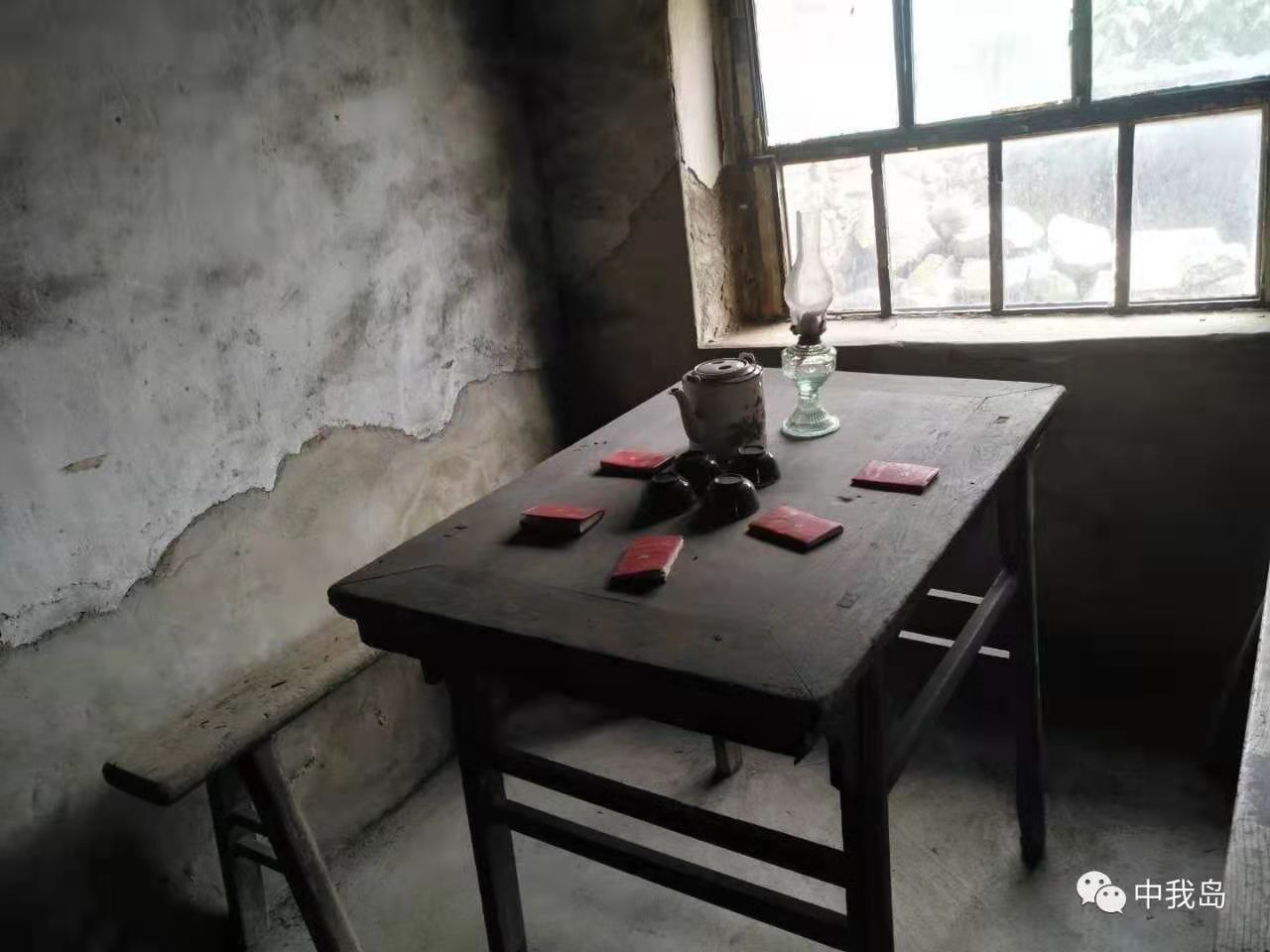 中我岛红色教育基地的地下党交通站,当年碰头开会的地方,一张有些年头的旧桌子,一盏照亮黑暗的罩子灯。共产党人出生入死,领导人民抗日救国,宏韬大略,施展抱负,全安放在破旧的海草房里。